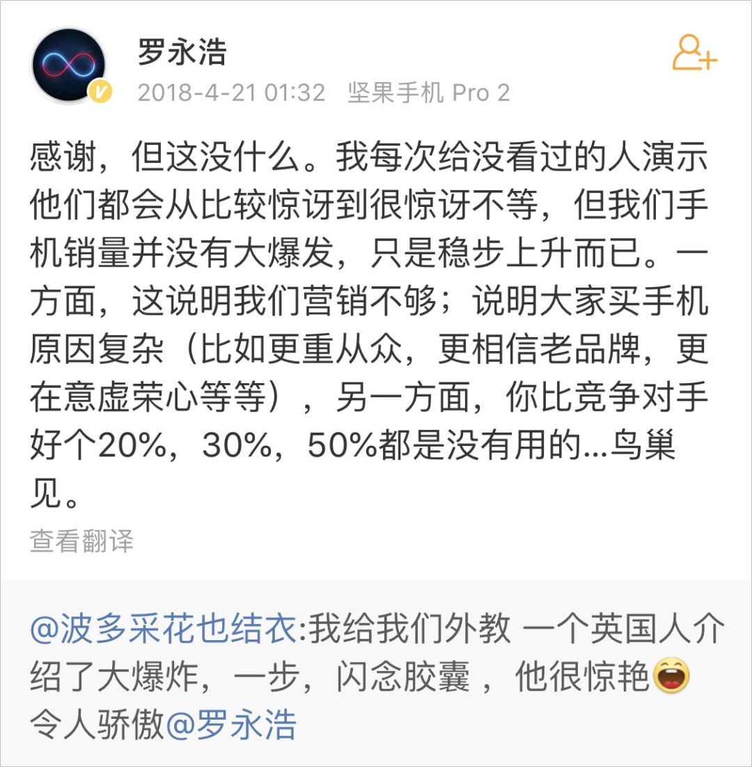 但是,產(chǎn)品是 1,營(yíng)銷是 0,這個(gè)道理我們都懂,脫離產(chǎn)品的營(yíng)銷毫無(wú)意義。如果老羅在實(shí)力營(yíng)銷的基礎(chǔ)上,能夠不斷對(duì)產(chǎn)品進(jìn)行更新迭代,更好地迎合用戶需求,他會(huì)在手機(jī)領(lǐng)域這片紅海殺出來(lái),高呼一聲:彪悍的人生,不需要解釋!