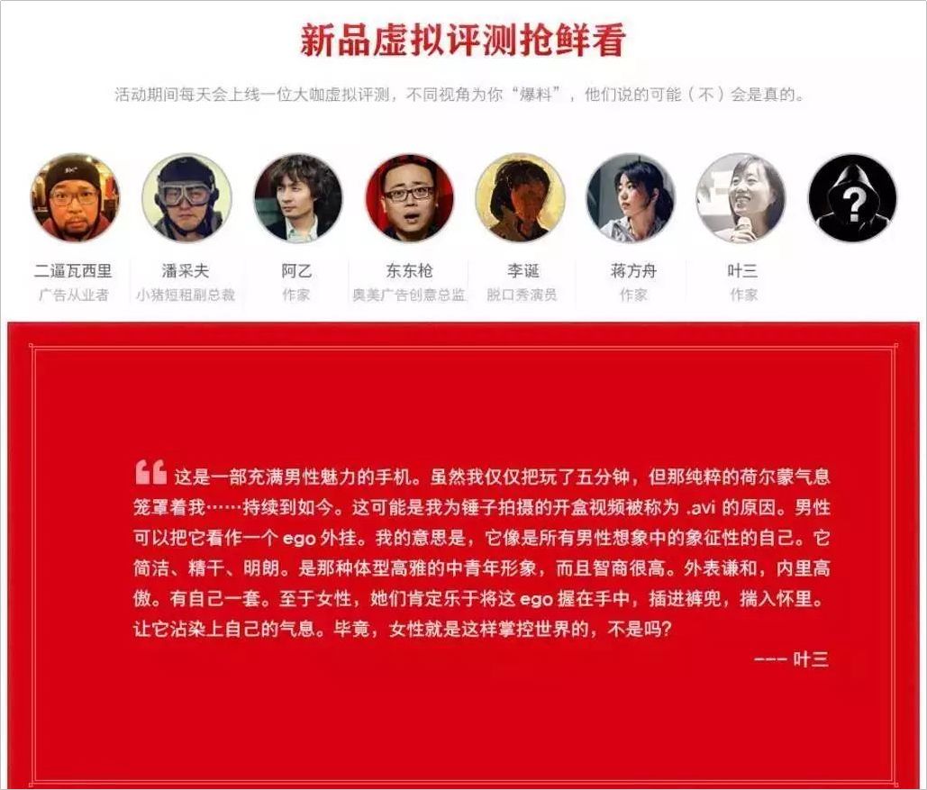 邀請(qǐng)各領(lǐng)域的大咖對(duì)錘子的新品進(jìn)行試用,寫(xiě)評(píng)測(cè)。每天上線一位大咖“爆料”,內(nèi)容的真實(shí)性不得而知,極具神秘性。