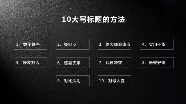 制造懸念好奇、與“性”相關(guān)、與“我”相關(guān)、包含沖突、利用具體數(shù)字、描繪細(xì)節(jié)、追熱點(diǎn)傍大款、知乎體、運(yùn)用對比、刺激痛點(diǎn)、提供解決方案、突出利益、營造緊迫氣氛、強(qiáng)調(diào)稀缺性、標(biāo)明地域、承諾價(jià)值、利用大V背書、盤點(diǎn)合集、前后添加修飾詞、暗示危險(xiǎn)、標(biāo)題有指導(dǎo)建議、直接標(biāo)明受益人、刺激情緒......等等。