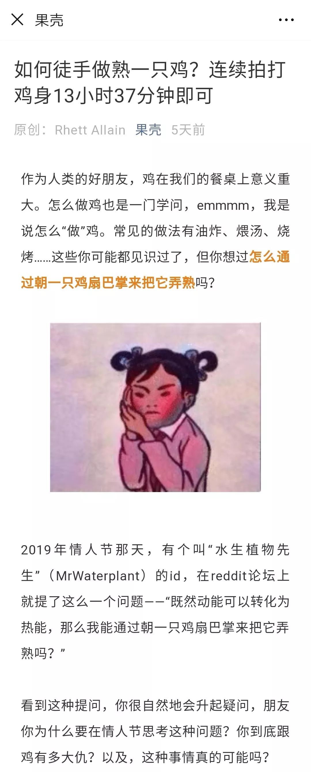 比如之前果殼網(wǎng)公眾號(hào)有一篇叫《如何徒手做熟一只雞?連續(xù)拍打雞身13小時(shí)37分鐘即可》的文章。