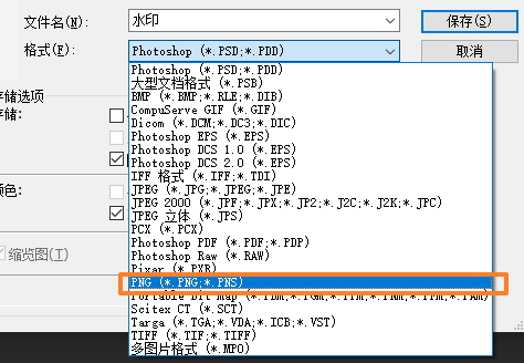 水印圖片的背景必須是透明的,在ps中的直觀感受是背景有大量的類似馬賽克的小方格。保存圖片時,輸出png格式: