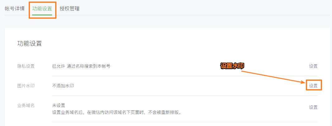 1、將鼠標(biāo)放到公眾號后臺首頁的右上角,點擊【功能設(shè)置】,設(shè)置水印。