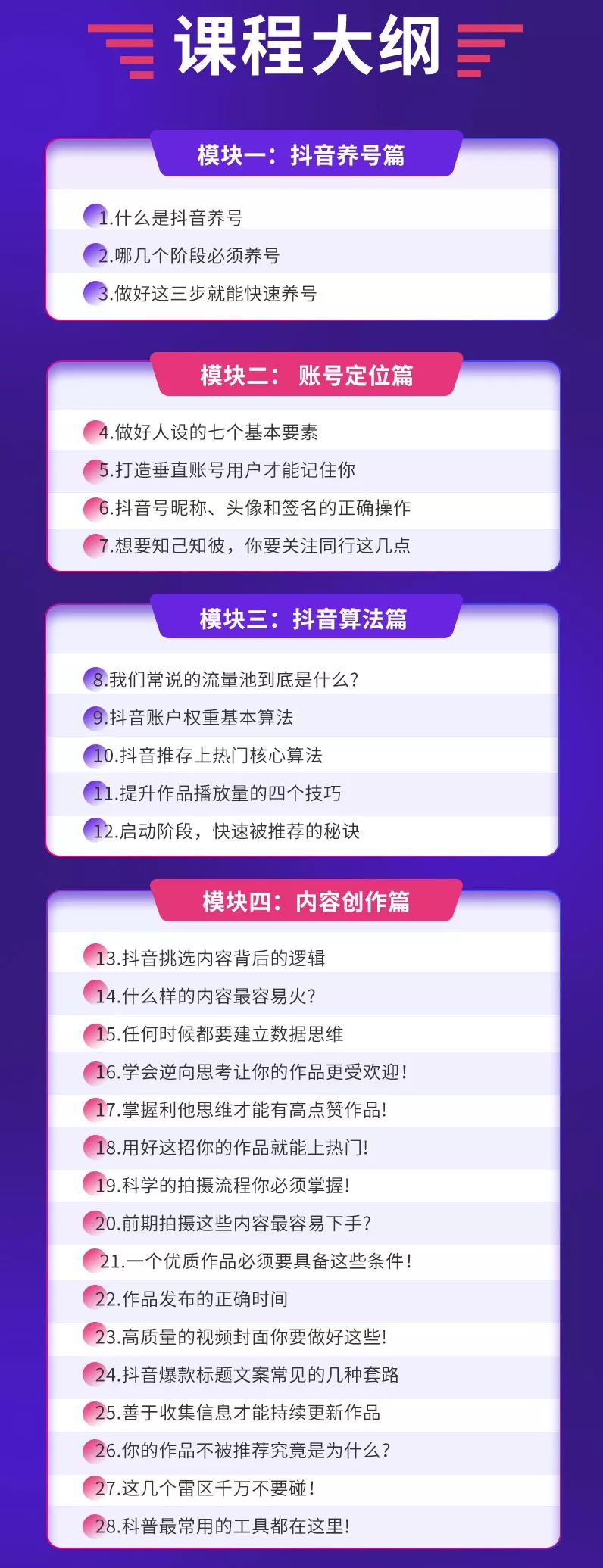 全權(quán)老師經(jīng)過半年時(shí)間精心準(zhǔn)備和研究,結(jié)合多年來孵化網(wǎng)紅的經(jīng)驗(yàn)和抖音成功案例,打磨出這套針對零基礎(chǔ)學(xué)員的課程。