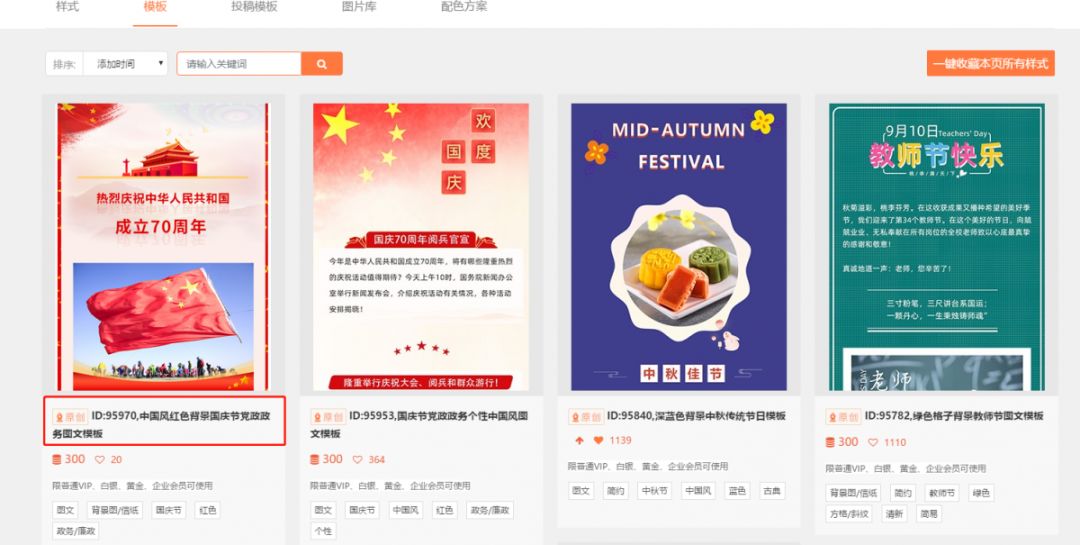 a.打開模板中心,找到中國風紅色背景國慶節(jié)黨政政務圖文模板(id:95970)進行收藏。