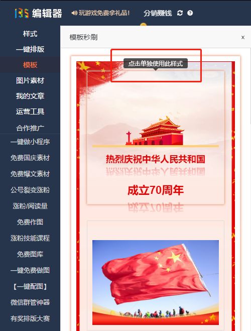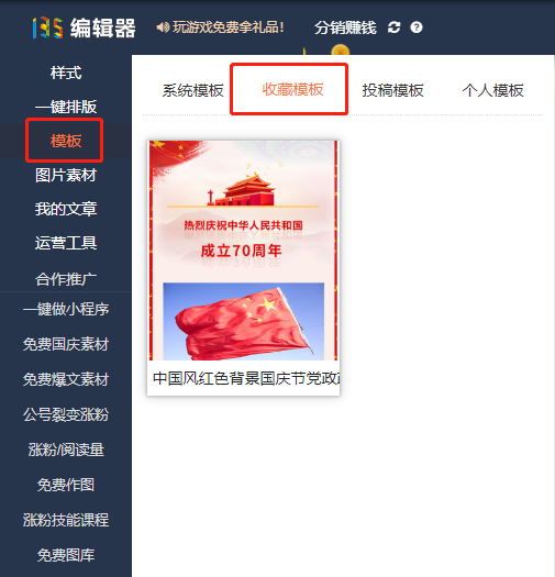 b.點擊編輯器左側的模板版塊,再點擊收藏模板找到中國風紅色背景國慶節(jié)黨政政務圖文模板,點擊分開使用(可秒刷)或整套使用。(注意:模板并不會收藏在樣式收藏夾里?。?!一定要點擊模板中的收藏模板進行查看!)
