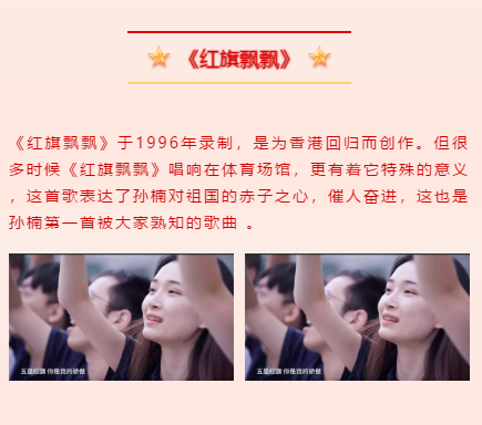 《紅旗飄飄》于1996年錄制,是為香港回歸而創(chuàng)作。但很多時候《紅旗飄飄》唱響在體育場館,更有著它特殊的意義 ,這首歌表達了孫楠對祖國的赤子之心,催人奮進,這也是孫楠第一首被大家熟知的歌曲 。