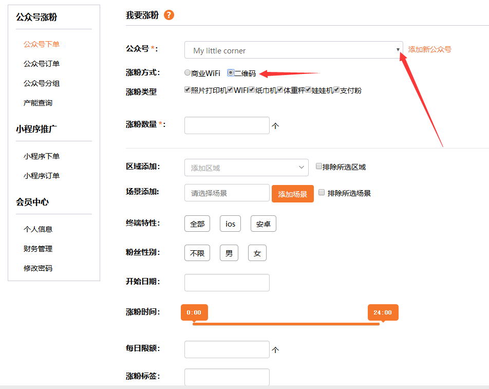 6、選擇要加粉的公眾號,選擇二維碼,按照提示操作即可。