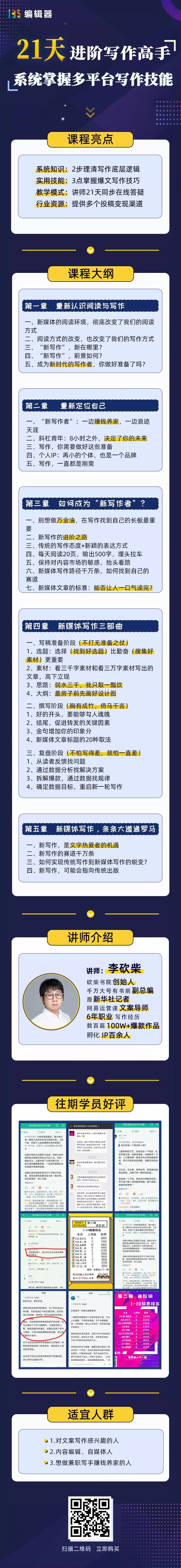 『21天進階寫作高手』特訓營,由李砍柴主講,帶領團隊歷時數(shù)月打磨,吸取多期學員遇到的問題,優(yōu)化升級,手把手教你從零基礎學習新媒體寫作。