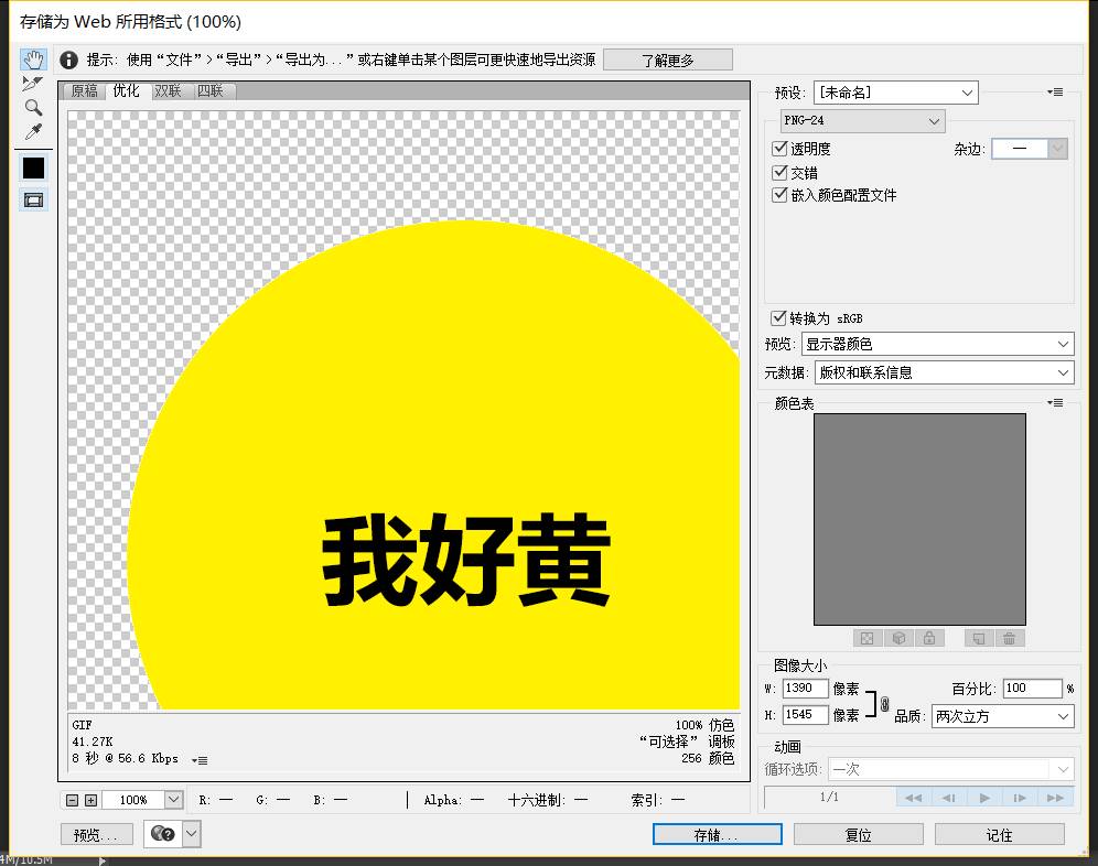 和導(dǎo)出GIF的方法類似。用PhotoShop打開原圖,點擊【文件】-【存儲為Web所用格式】,進行以下設(shè)置,再存儲為PNG格式即可。