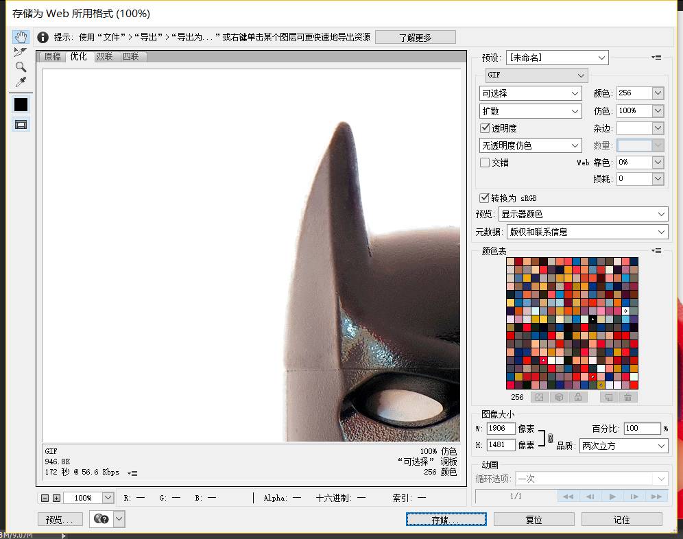 用PhotoShop打開原圖,點擊【文件】-【存儲為Web所用格式】,進行以下設(shè)置,再存儲為GIF格式。