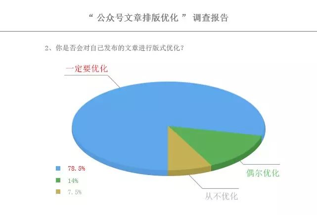 調(diào)查顯示:78.5%的運營者一定要做排版優(yōu)化;14%的運營者偶爾會做;只有7.5%的運營者不做優(yōu)化,排版已經(jīng)是評判一個公眾號品質(zhì)的重要標(biāo)準(zhǔn)。