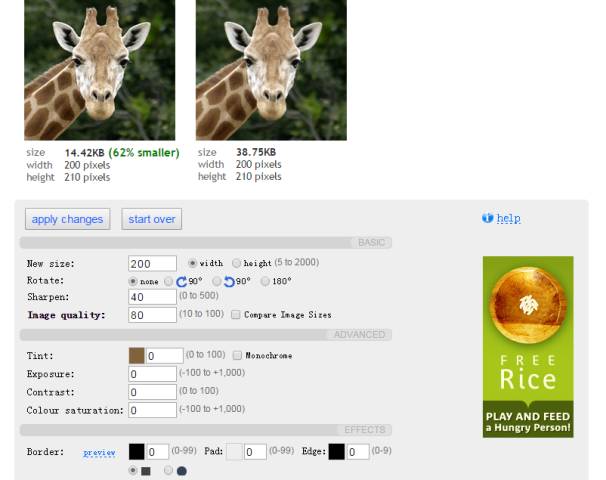 進(jìn)入網(wǎng)站后,點(diǎn)擊紅色的resize photos now現(xiàn)在調(diào)整照片,上傳圖片(最大5M),然后就可以設(shè)置選項(xiàng),主要是Image quality:壓縮質(zhì)量,數(shù)值越小圖片越小質(zhì)量越不好,自行選擇。選好后,點(diǎn)擊apply changes應(yīng)用修改,滿意的話可以點(diǎn)擊download this image下載圖片,搞定。