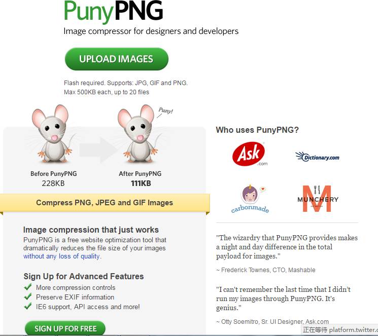 看名字就應(yīng)該知道,這個(gè)網(wǎng)站的長項(xiàng)是壓縮PNG格式的圖片。當(dāng)然,同時(shí)也支持JPG、GIF圖片壓縮。