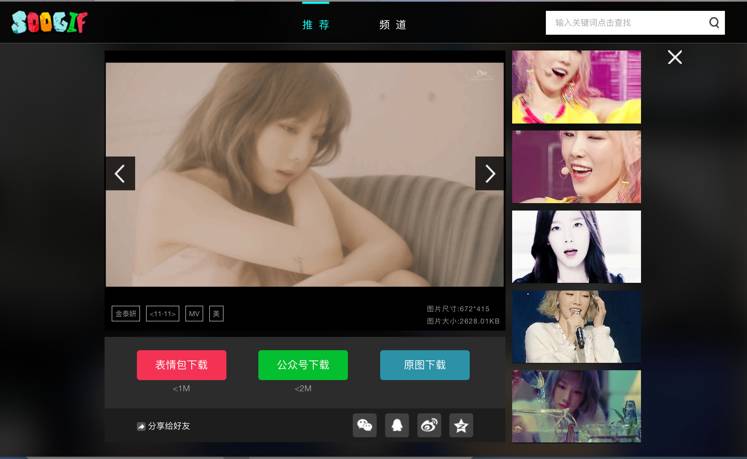 網(wǎng)站提供3種尺寸:原圖尺寸、微信公眾號素材尺寸(<2M)、表情包尺寸(<1M)。也就是說你只要找到需要的GIF圖,然后自己選擇合適的尺寸下載就行了,Soogif網(wǎng)站會(huì)幫你壓縮好,省去了你自己截取、上傳的時(shí)間。對于寫文章找配圖的小編們有奇效。