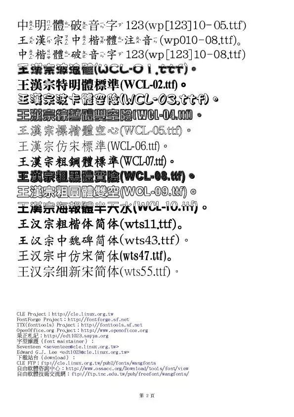 臺灣中原大學(xué)數(shù)學(xué)系王漢宗免費(fèi)捐贈,依 GNU GPL 開放供公眾使用的 TrueType 字型。全部都是 Unicode 字型,在 OpenOffice.org/Mozilla/Firefox/PDF 中可正常顯示使用。2004年與文鼎發(fā)生版權(quán)糾紛,Justfont經(jīng)專業(yè)的比對和硏究,證實(shí)王敎?zhǔn)诘囊恍┳煮w,并不涉及與文鼎字型的版權(quán)糾紛。