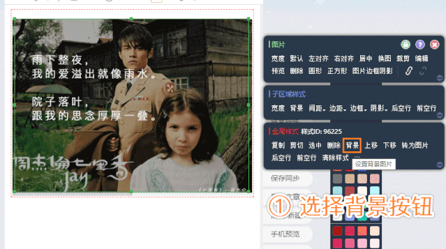 3、點擊樣式,在彈出的專業(yè)版菜單中選擇『背景』,然后點擊『背景設置』,選擇『上傳本地圖片』,底部圖片即可更換完畢。