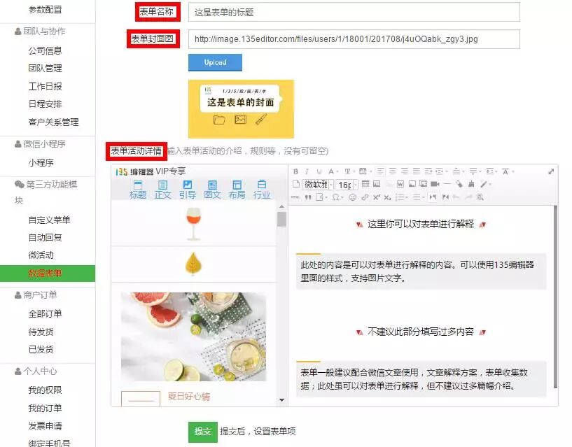 進(jìn)入編輯頁面,首先需要設(shè)置表單的標(biāo)題、封面圖片以及內(nèi)容描述。