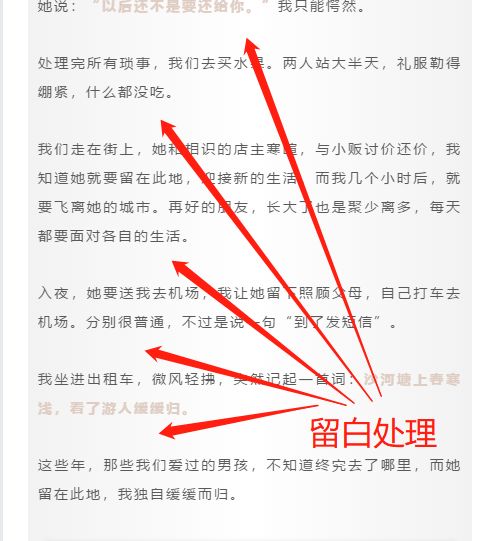 所謂的留白除了設(shè)置兩側(cè)邊距達(dá)到兩側(cè)留白的效果以外,還有一種方式就是利用提行(空行或者設(shè)置段后距)的方式進(jìn)行留白的處理,打造文章的呼吸感。
