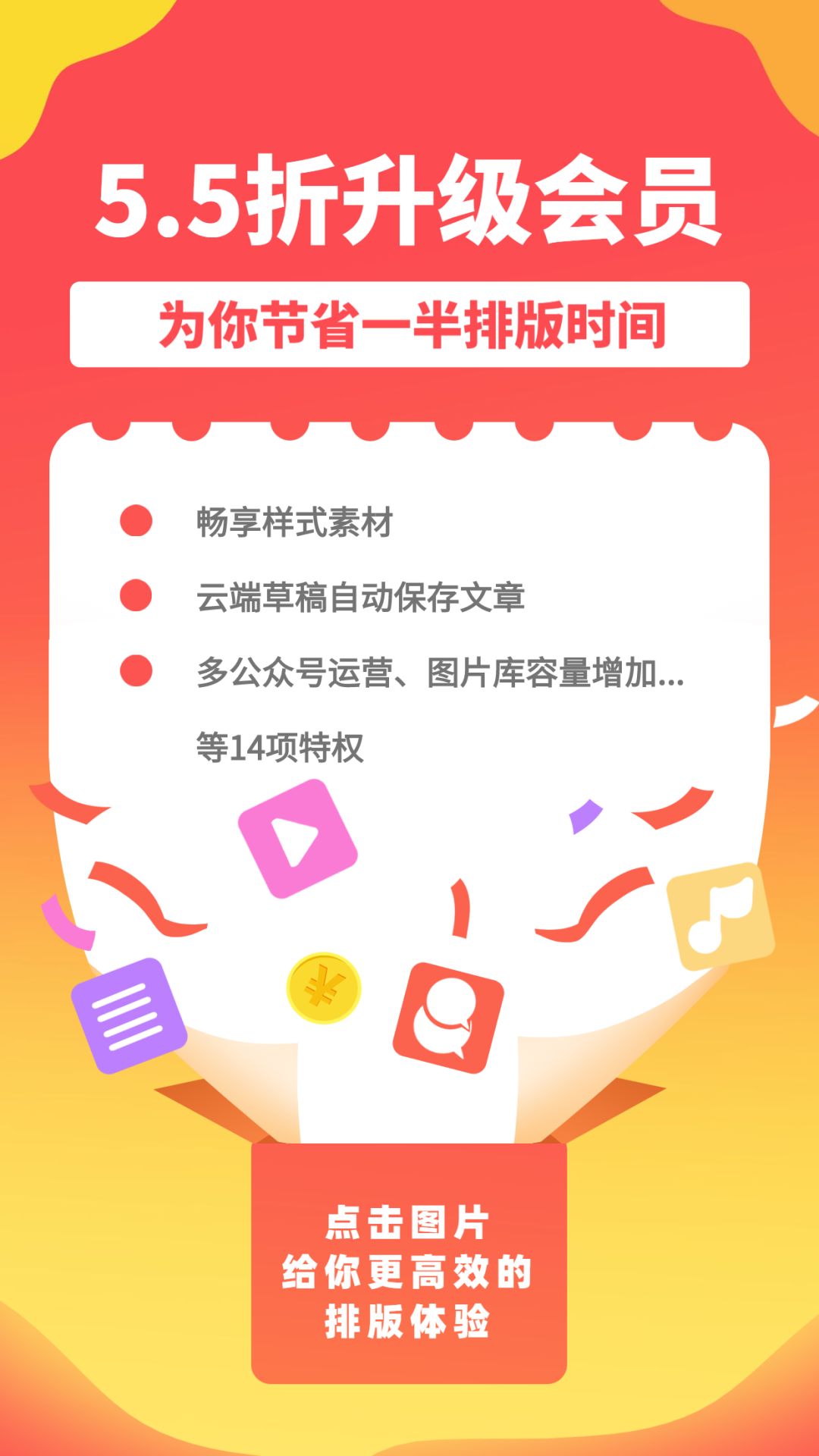 2、超多會(huì)員權(quán)限等你解鎖:升級(jí)會(huì)員后,不但有全場10萬+樣式免費(fèi)用,而且還有云端草稿,定時(shí)群發(fā),一件排版等功能等你來解鎖!