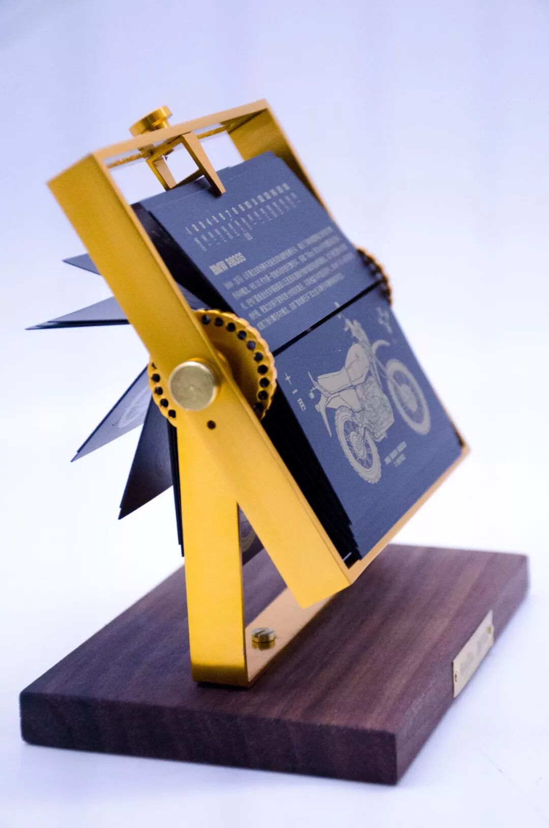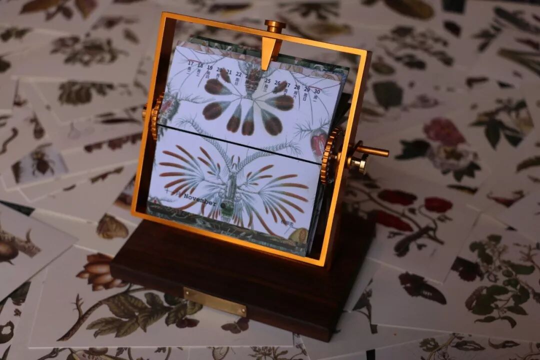 這是一款半月歷,每半個月通過右側(cè)的搖臂來翻轉(zhuǎn)日歷葉片。