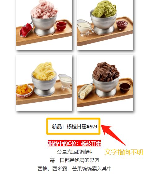 同樣的問題,在第一部分的內(nèi)容中,每一個(gè)新品都只進(jìn)行了簡(jiǎn)單的加粗處理,那么這到底是圖片的注釋呢還是新品的名字?我相信有很多小伙伴和我一樣分不清這些文字到底指向的是哪一部分的內(nèi)容。