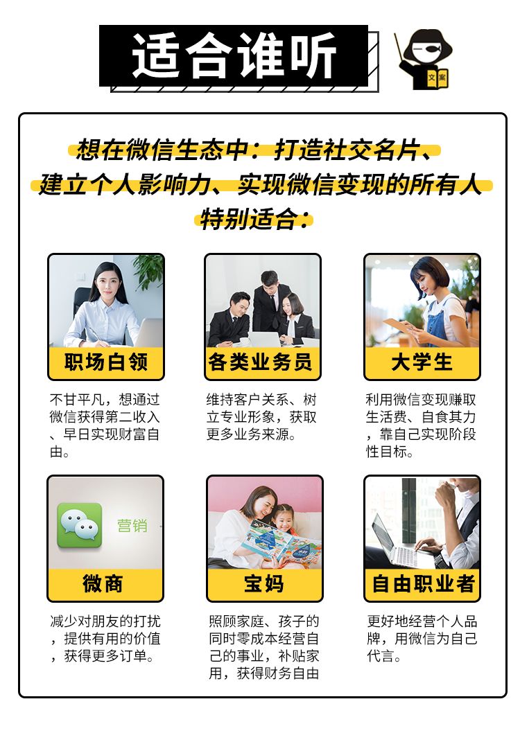 讓你從文案底層邏輯、微信營銷方法、個(gè)人形象定位等,找到屬于你的變現(xiàn)利器,讓你0基礎(chǔ)學(xué)完馬上就能用,讓你也和我一樣獲得更多資源與收入。