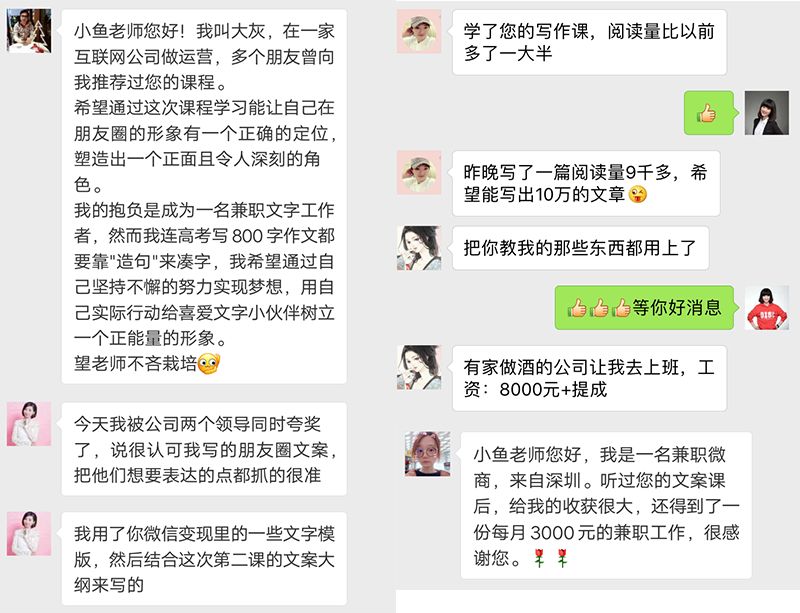 在我的文案課上,很多進(jìn)步飛快的小伙伴,寫出來的文案,直接就被客戶錄用,課程還沒學(xué)完,就賺回了自己交的學(xué)費(fèi)。