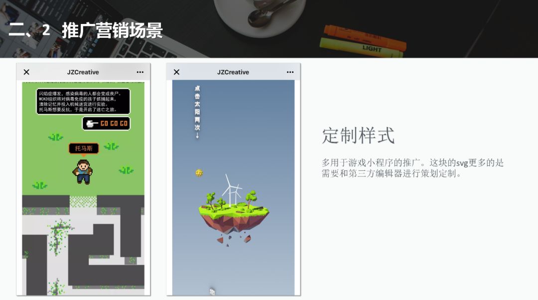 3)推廣營銷。如游戲小程序的推廣,這塊的svg更多需要和第三方編輯器進行策劃定制,像吃雞游戲就做過這種定制;