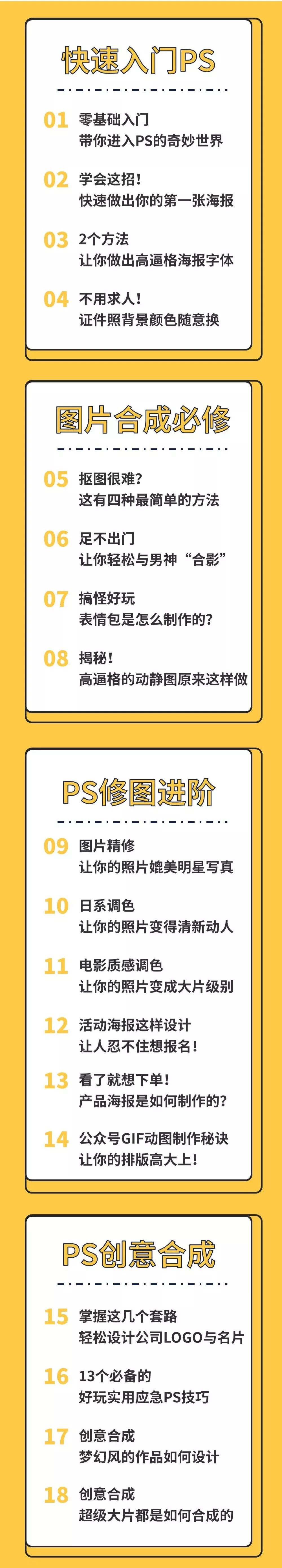 他在這套課程的設計上,認真調研了用戶的需求,其中有80%的用戶是想了解如何用PS來完成海報、設計,照片修圖,更好地完成工作。
