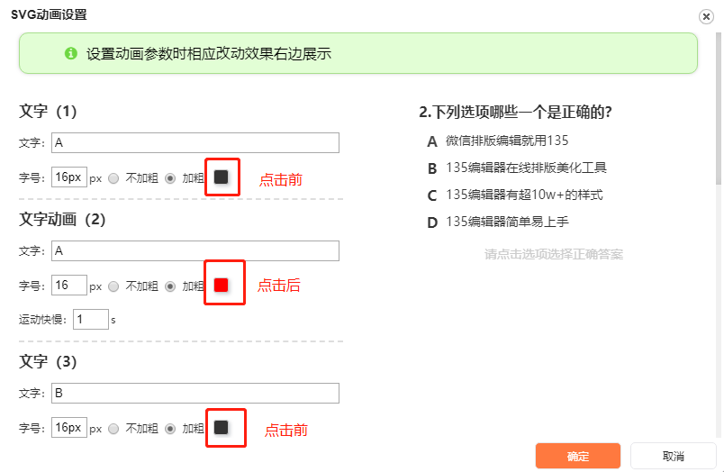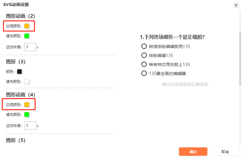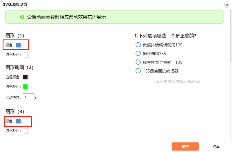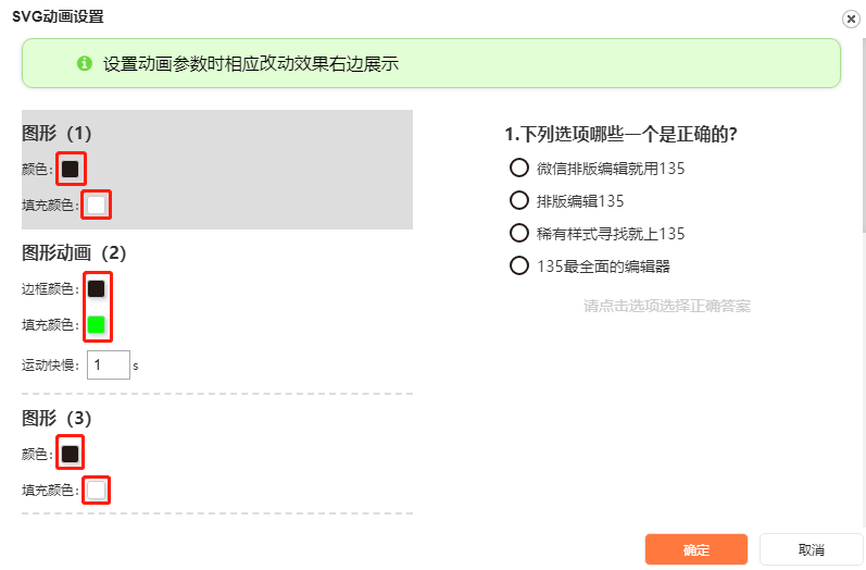 點(diǎn)擊選擇題樣式彈出動(dòng)畫設(shè)置框后,可以看到有三個(gè)色彩更改選項(xiàng)。在修改SVG樣式時(shí),將鼠標(biāo)放在任一色塊上,右邊的樣式展示區(qū)都會(huì)有相應(yīng)的閃動(dòng),以確認(rèn)我們是否在進(jìn)行正確參數(shù)的修改。