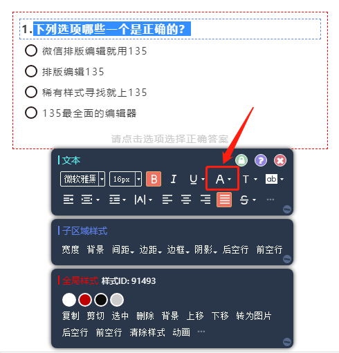 方法一:選擇需要修改的文字(請(qǐng)注意一定要彈出藍(lán)色子區(qū)域方框才可進(jìn)行操作),通過(guò)編輯器上方的工具欄直接修改顏色。