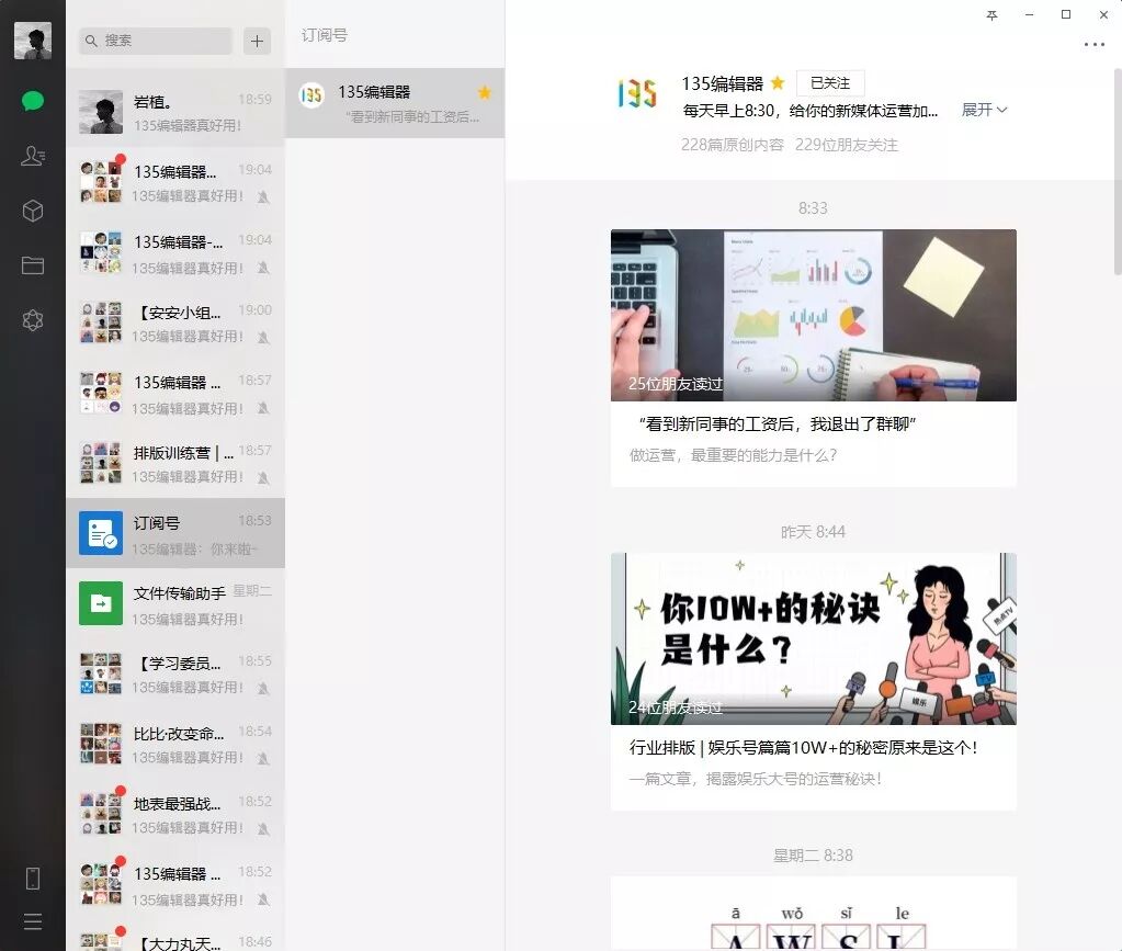 此次版本更新后,點(diǎn)擊訂閱號(hào)內(nèi)任一公眾號(hào),會(huì)彈出一個(gè)新的界面,和手機(jī)端類似,有公眾號(hào)簡(jiǎn)介、頭條文章多少位好友讀過(guò)等內(nèi)容。