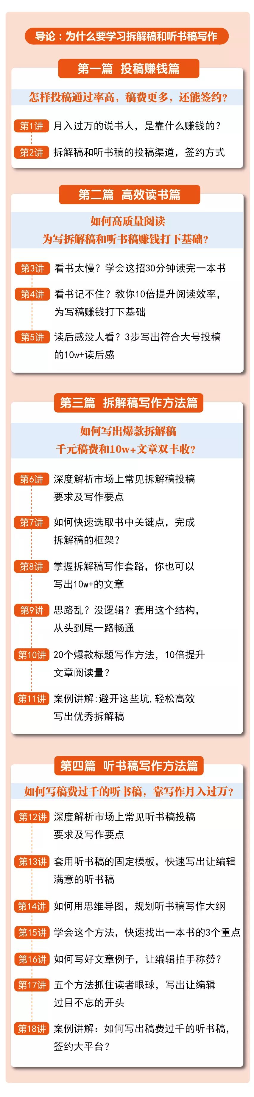 課程將會告訴你,什么是聽書稿、如何讀書、如何寫稿、如何提升過稿率……