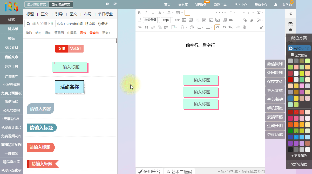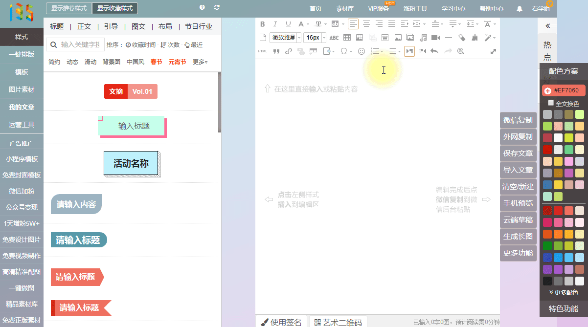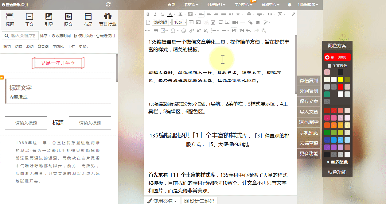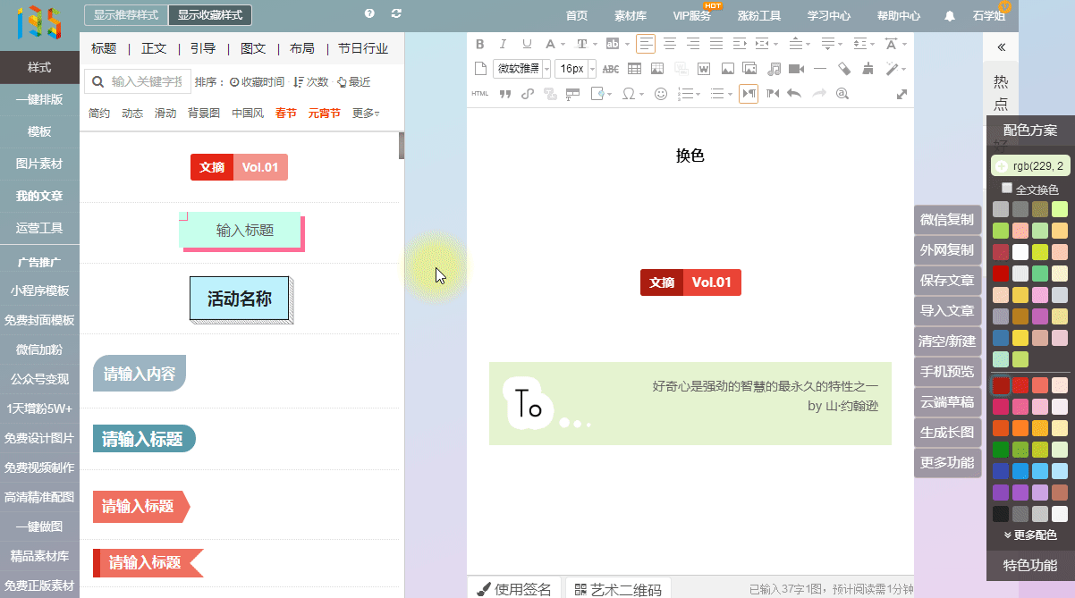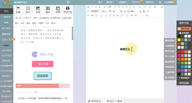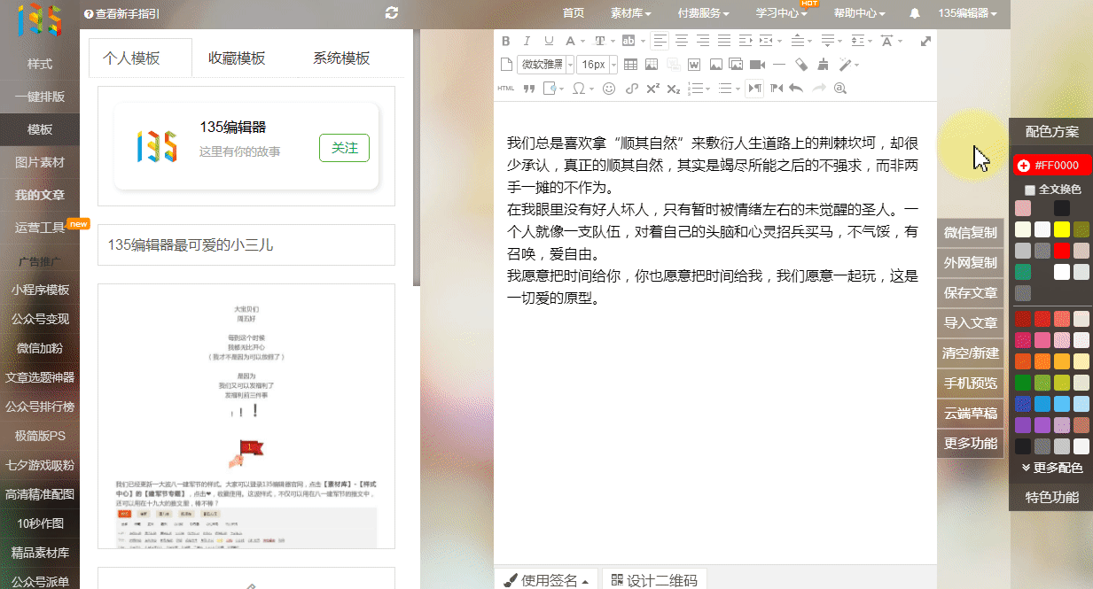 編輯區(qū)內(nèi)放置需要排版的內(nèi)容,選擇相應(yīng)的一鍵排版模板,即可瞬間完成排版工作。