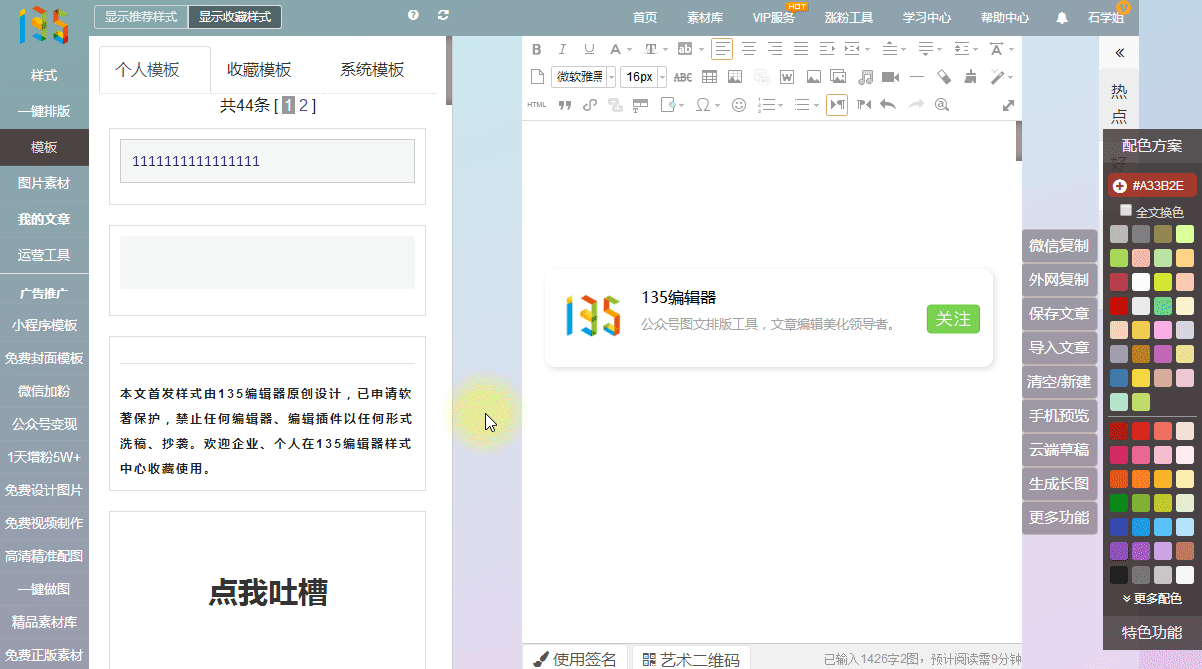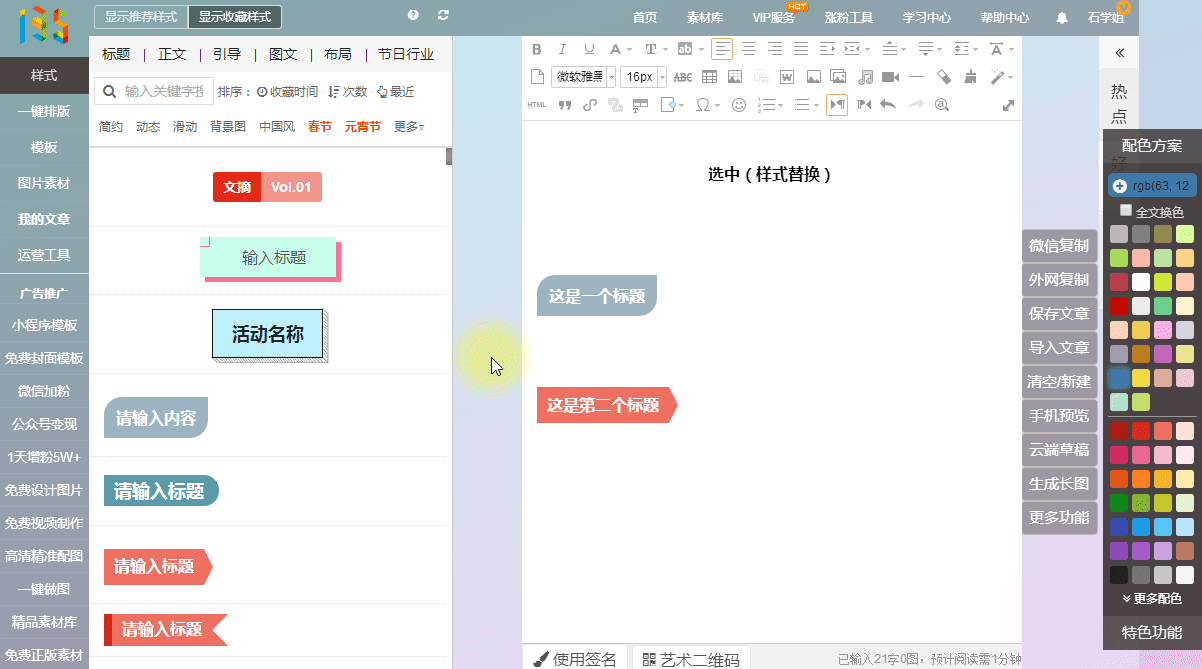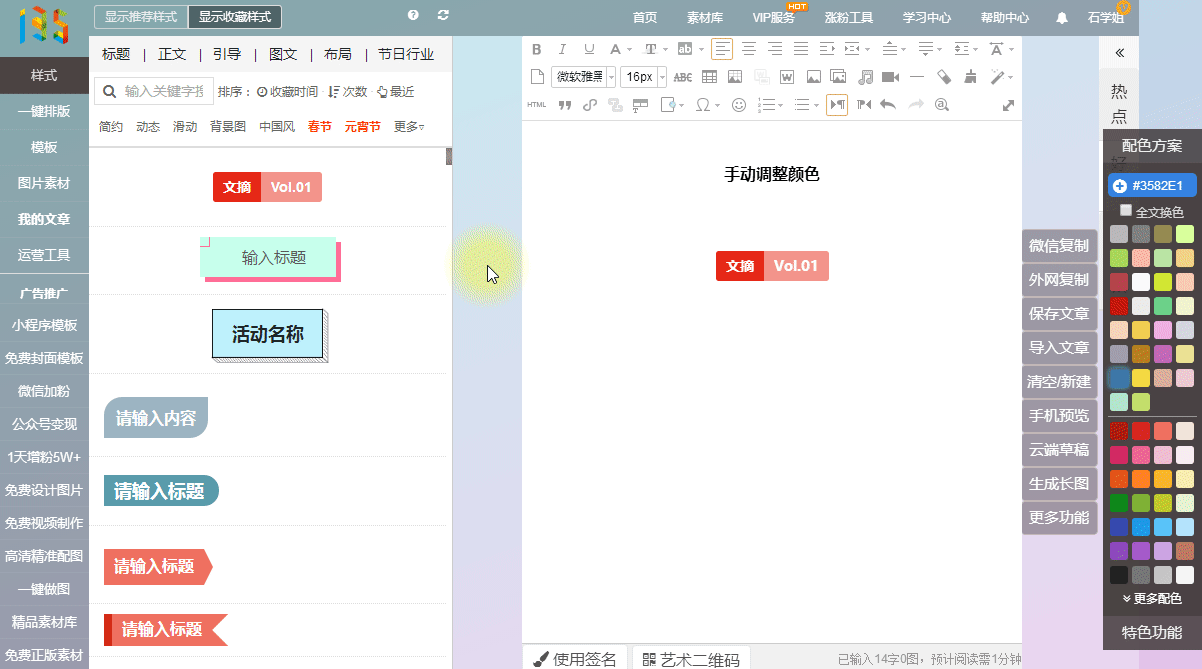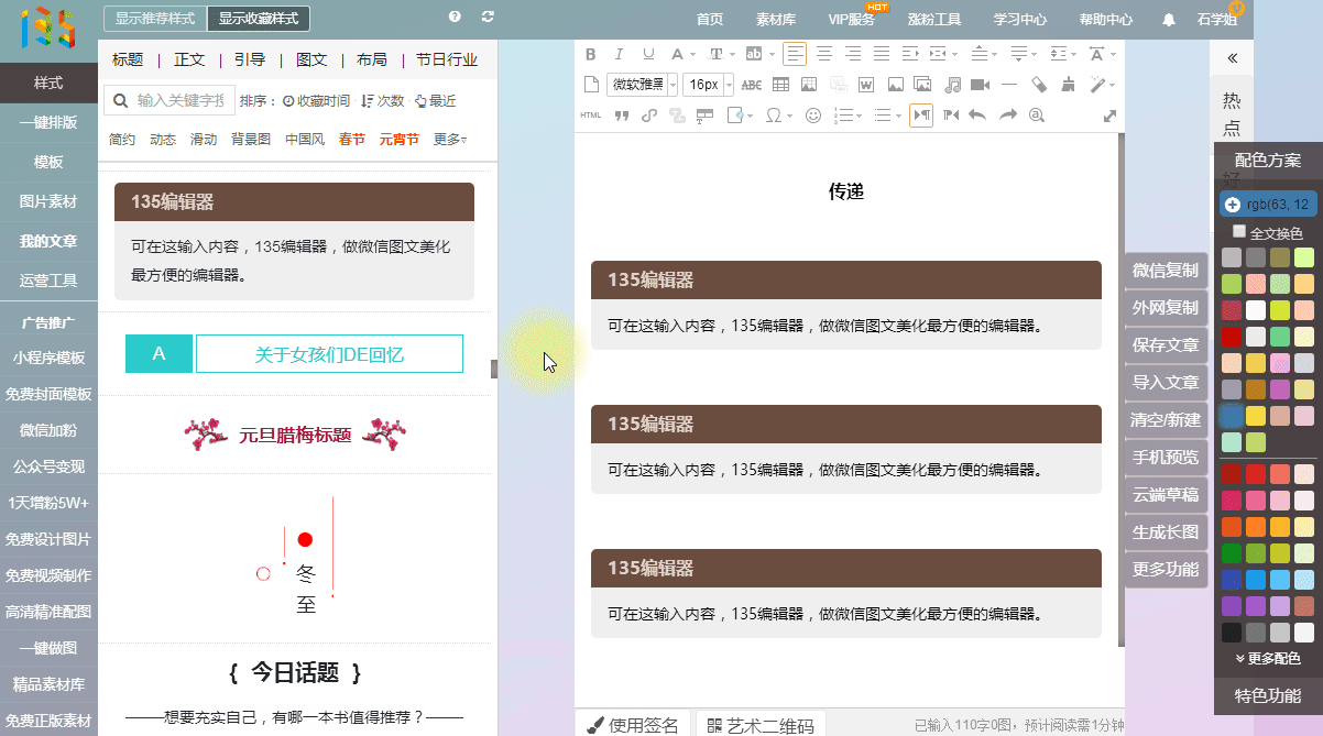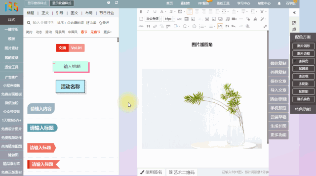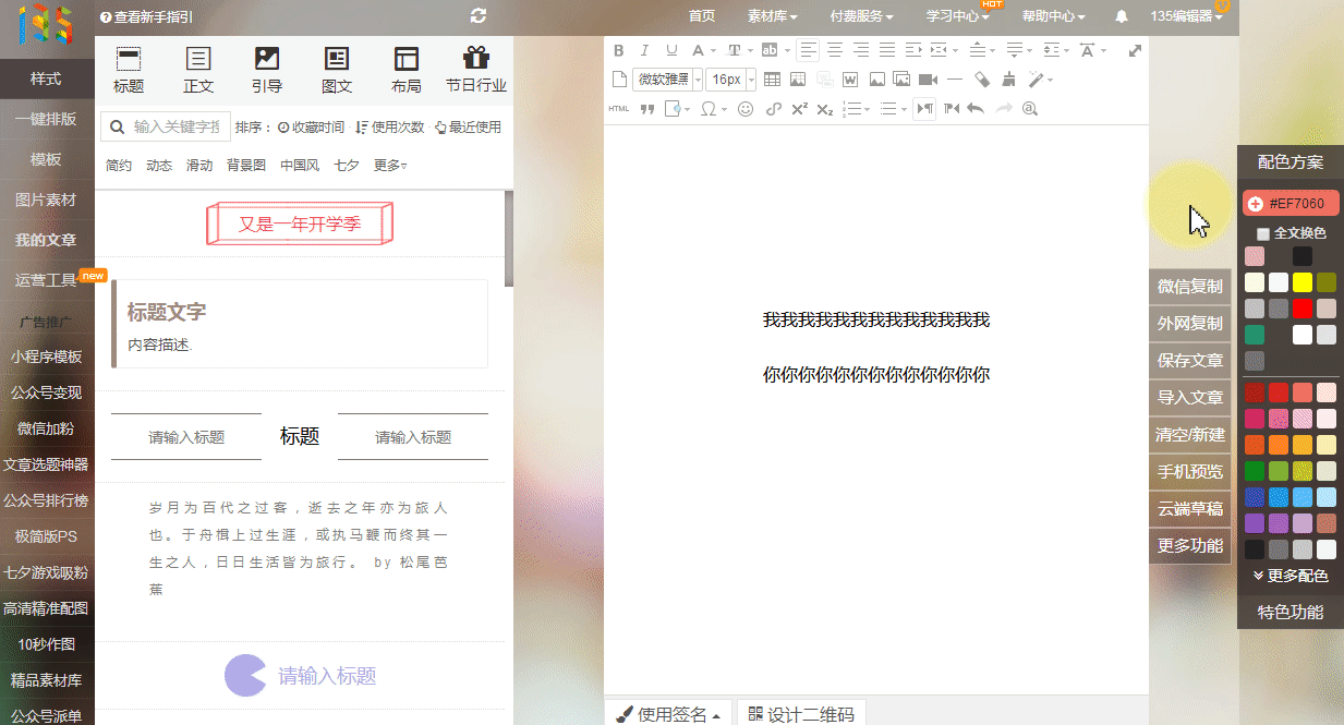 編輯區(qū)內(nèi)放置需要排版的內(nèi)容,選擇相應(yīng)的一鍵排版模板,即可瞬間完成排版工作。