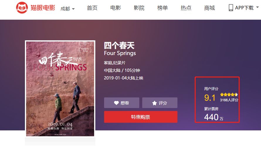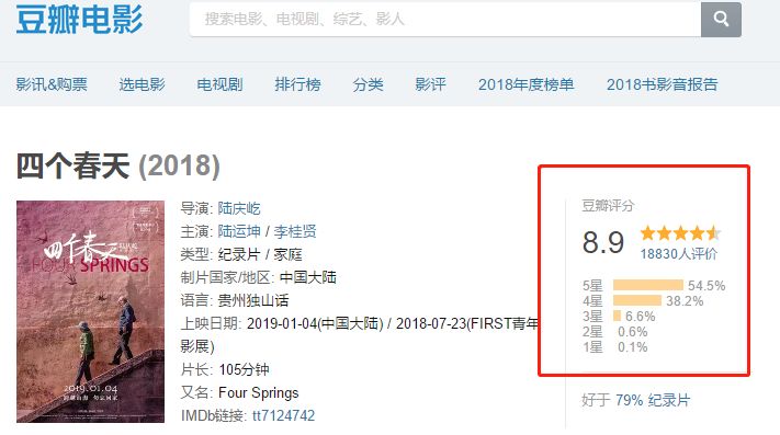 年關(guān)將至,有一部紀(jì)錄片不僅刷爆了朋友圈而且大半個(gè)娛樂(lè)圈也都在推薦,薦止目前此片豆瓣評(píng)分8.9,貓眼評(píng)分9.1,成本只有1500元和排片率只有1.6%的情況下,票房目前卻接近600萬(wàn),上座率更是遠(yuǎn)遠(yuǎn)超過(guò)同期大熱門電影《大黃蜂》和《來(lái)電狂響》。