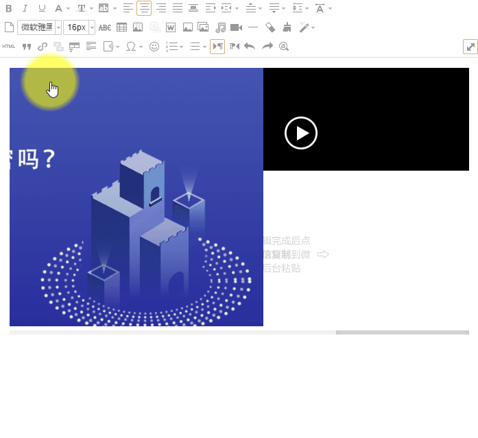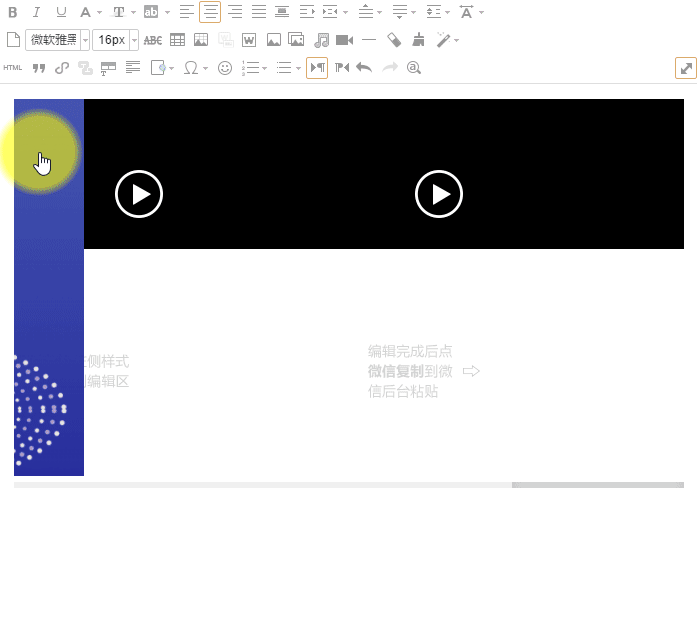 此樣式默認是一個視頻,如果你非要再添加視頻,也是可以的,但數(shù)量不能超過3個。進入HTML模式,復(fù)制<section style="display: inline-block;......></iframe></section>,并粘貼在其后,退出HTML模式就成功新添加了一個視頻。