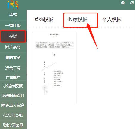 b.點(diǎn)擊編輯器左側(cè)的模板版塊,再點(diǎn)擊收藏模板找到詩(shī)歌模板,直接秒刷/插入模板進(jìn)行使用。(注意:模板并不會(huì)收藏在樣式收藏夾里?。?!一定要點(diǎn)擊模板中的收藏模板進(jìn)行查看?。?/span>