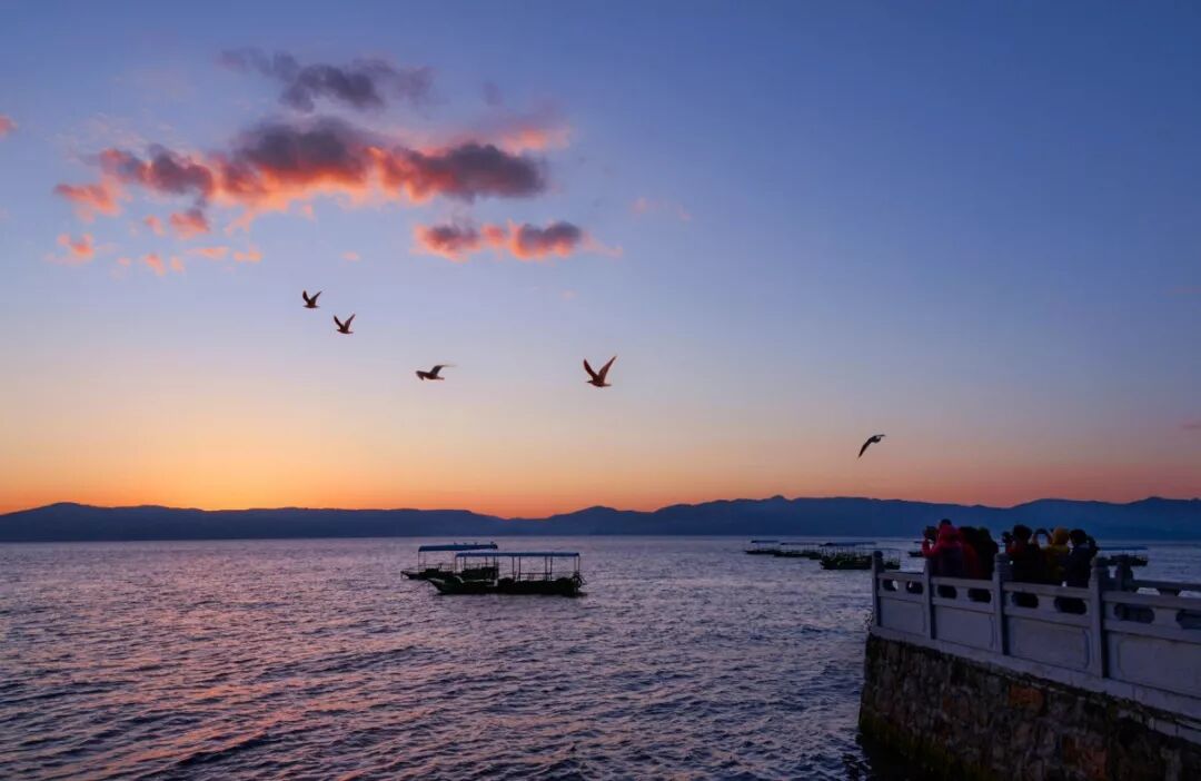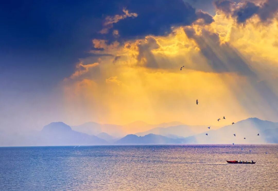 撫仙湖的沙灘、白云、碧波,一切都吸引著人在微風吹拂的午后劃船游湖。陽光從云里透出一縷縷金色光芒,隨便一幀都像潑墨山水畫。另外,撫仙湖的夕陽落日值得一看~