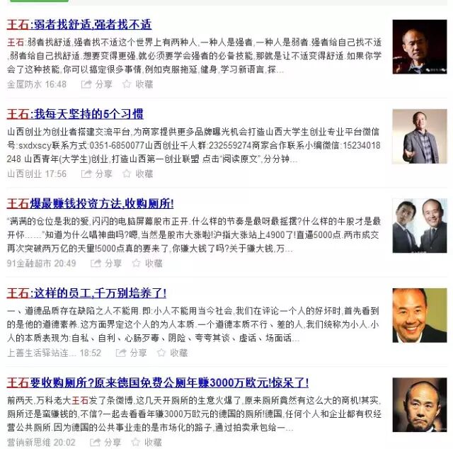 比如同樣是關(guān)于萬科王石的照片,這個(gè)素材中第三個(gè)配圖屬于惡搞,第四個(gè)背景泛黃,略顯老舊。以下五個(gè)相比較而言《王石:弱者找舒適,強(qiáng)者找不適》,配圖略較好,能凸顯王石的硬漢性格。