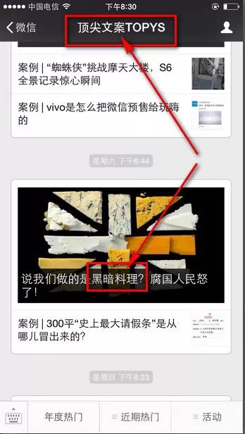反面案例,頂尖文案TOPYS,一個(gè)關(guān)于文案的公眾號(hào),發(fā)和美食相關(guān)的文章,偏離的有點(diǎn)遠(yuǎn)。
