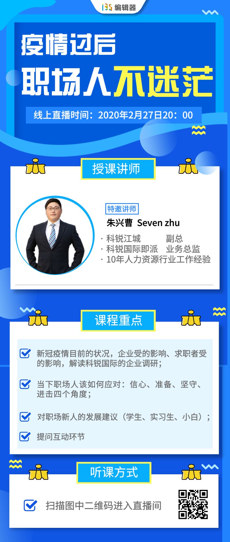本次的職場發(fā)展課,將從疫情過后職場人面臨的問題出發(fā),分析疫情之下,企業(yè)和求職者受到的影響,當(dāng)下職場人應(yīng)該如何應(yīng)對(duì)并對(duì)職場新人做出職場發(fā)展建議。