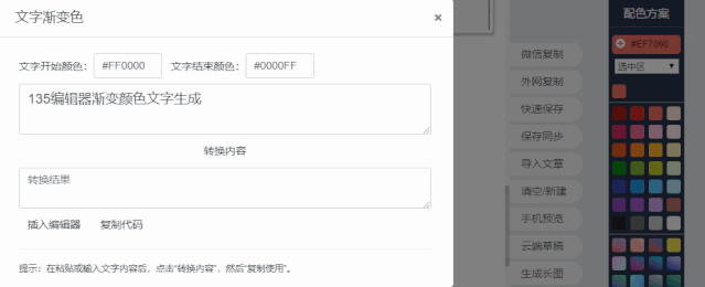 首先輸入你想要漸變效果的文字,再選擇文字漸變的兩種顏色,點擊轉(zhuǎn)換內(nèi)容,最后點擊『插入編輯器』使用即可!