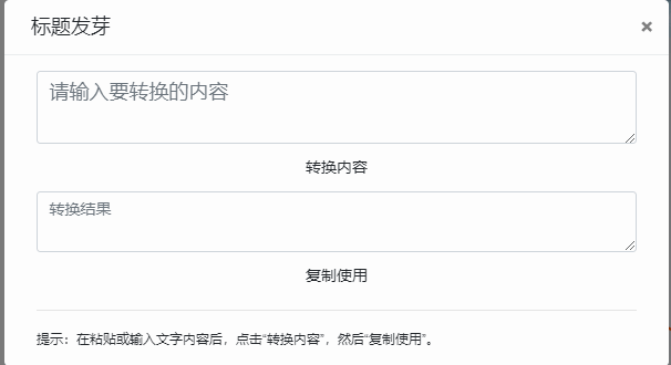 第一欄輸入你想要的文字,點擊『轉(zhuǎn)換內(nèi)容』,在第二欄就會出現(xiàn)轉(zhuǎn)換成功的內(nèi)容,復(fù)制使用即可!