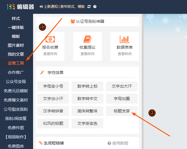在135編輯器左側(cè)菜單欄,點擊『運營工具』,點擊『標(biāo)題發(fā)芽』,就可以使用了。