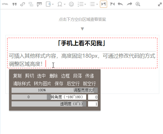 收藏樣式后,直接在編輯器內(nèi)使用,替換中間【可插入其他樣式內(nèi)容,高度固定180px,可通過修改代碼的方式調(diào)整區(qū)域高度!】這段文字即可。如果是隱藏圖片就直接上傳一張圖片。