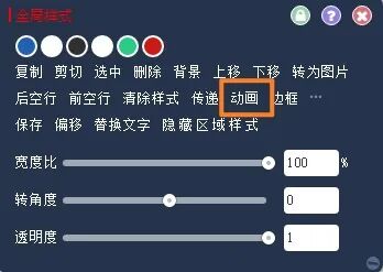 將編輯器切換到專(zhuān)業(yè)版模式,點(diǎn)擊樣式區(qū)域彈出對(duì)話框,在【全局樣式】中點(diǎn)擊動(dòng)畫(huà)按鈕,開(kāi)始修改SVG樣式參數(shù)。