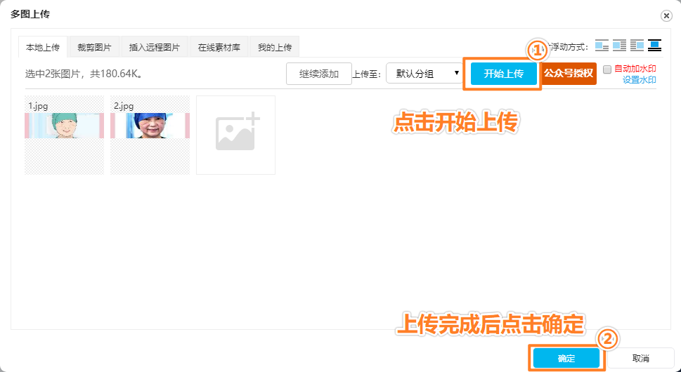 首先,我們需要將圖片上傳至135編輯器中。選擇編輯區(qū)上方的圖片上傳按鈕,選擇你制作好的圖片(兩張圖片需尺寸一樣),點(diǎn)擊上傳按鈕。