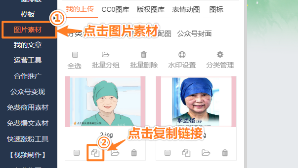 在135編輯器中,找到左側(cè)的『圖片素材』,在這里保存著你所在135編輯器中上傳的圖片。找到你剛上傳的圖片素材,點(diǎn)擊下方的復(fù)制按鈕,即可復(fù)制圖片的地址。