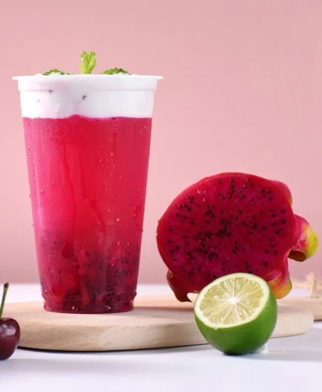 3.剩下的火龍果肉連同紅茶,煉奶一起放入榨汁機(jī),打成汁。